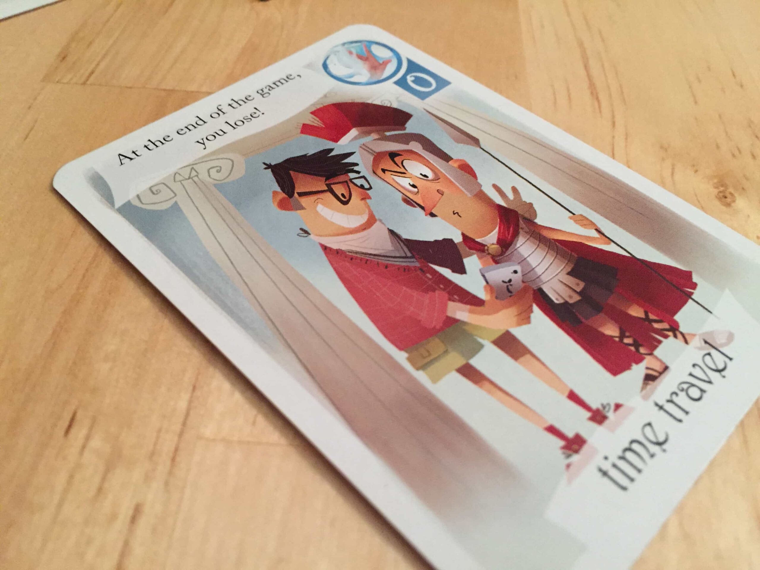 The Time Traveler card cannot be in your hand at the end of the game. If it is, you lose immediately. So there is always a risk of blindly flipping your cards, no matter how well you think you’ve prepared. And if someone keeps trying to get rid of a card, it’s pretty good odds, it’s the Time Traveler.