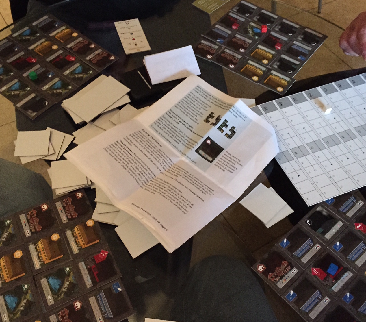 Finally, there’s the accessibility factor. The game plays 3-7 players using the default rules. But there’s also a two player variant that doesn’t require a “bot” player, and as part of the Kickstarter, there will be a single player automata variant. Better yet, as long as one or two people at the table know how to play the game, it’s easy to onboard new players. Because everyone is paired with two other players to build their city, it’s self-teaching – setup and rules walkthrough take all of five minutes and the game itself takes only 20-25.
