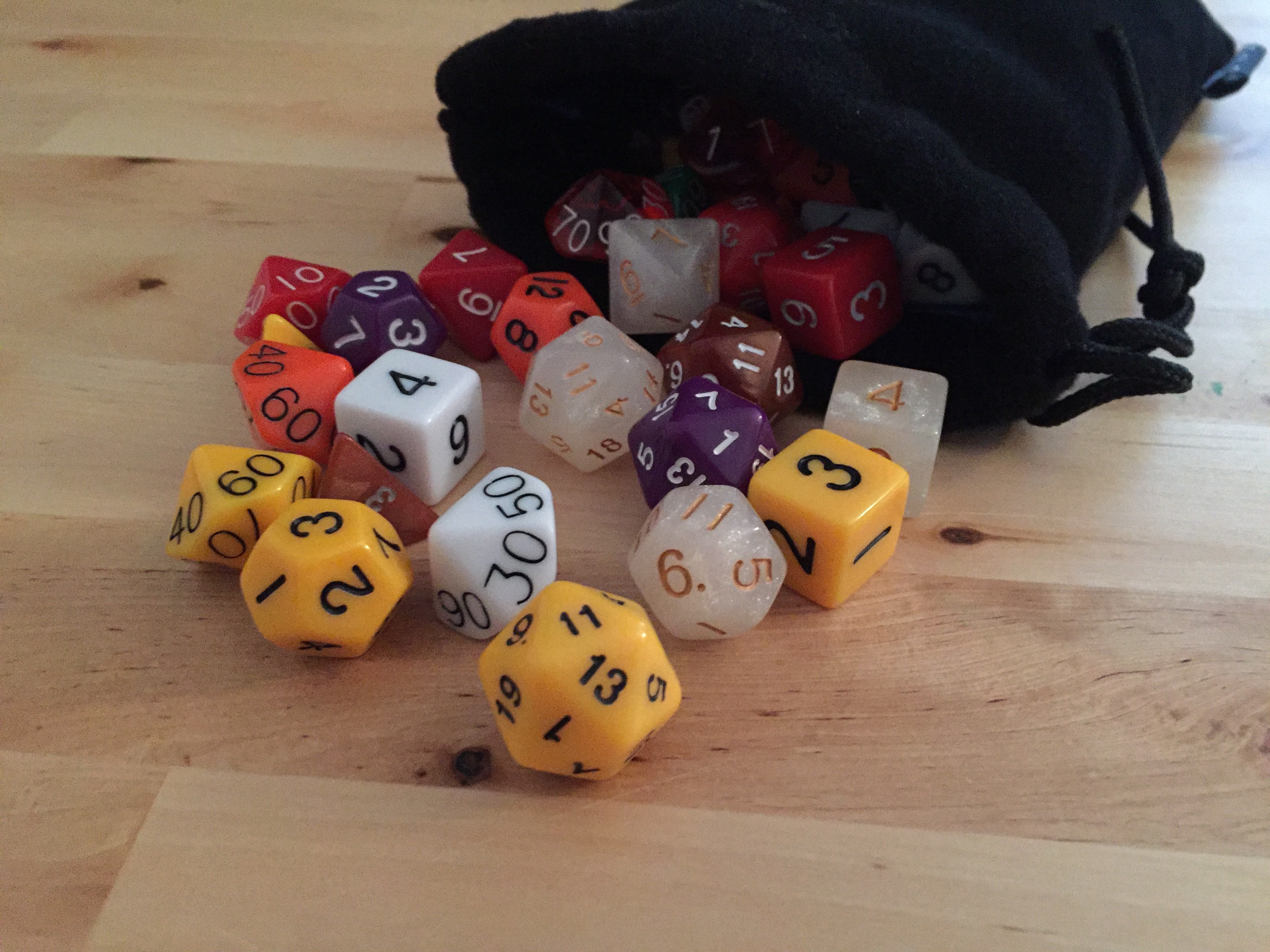 Okay, for those of you who don’t quite need a set of metal dice, but who LOVE having a lot of dice on hand for big groups, Easy Rider does sell the good old stuff as well. Along with the metal dice we tested, we also received a bulk bag of 15 sets of 7-count polyhedral dice. The bag is fantastic and big enough for all 100+ dice, the dice are solid and offer a range of colors, and the price is very good. Plus you can throw in one of the branded dice bags (a nice upgrade over that Crown Royale bag you’ve been using) and you’re still spending a lot less than you might on the cubed dice packs at your FLGS.