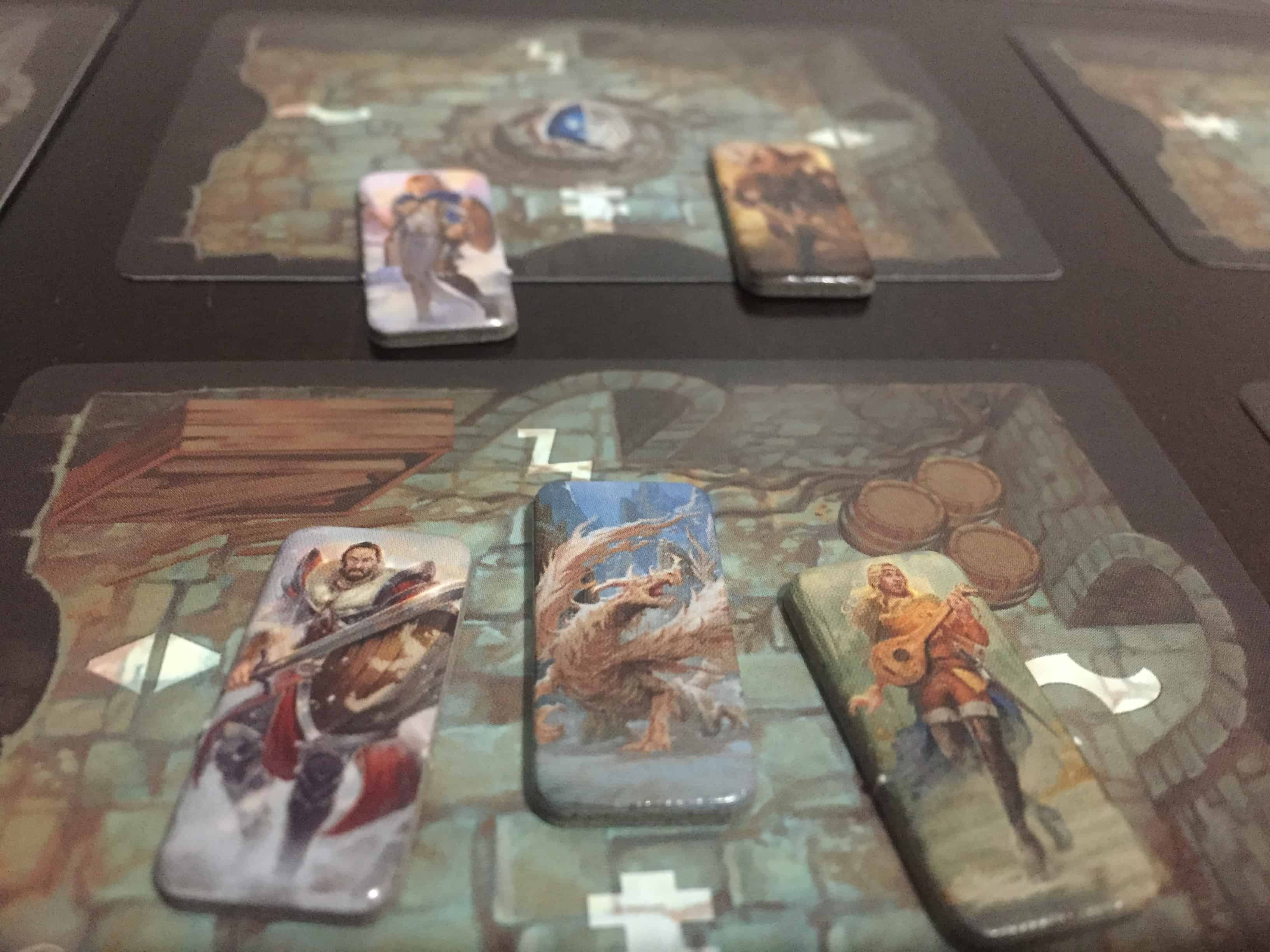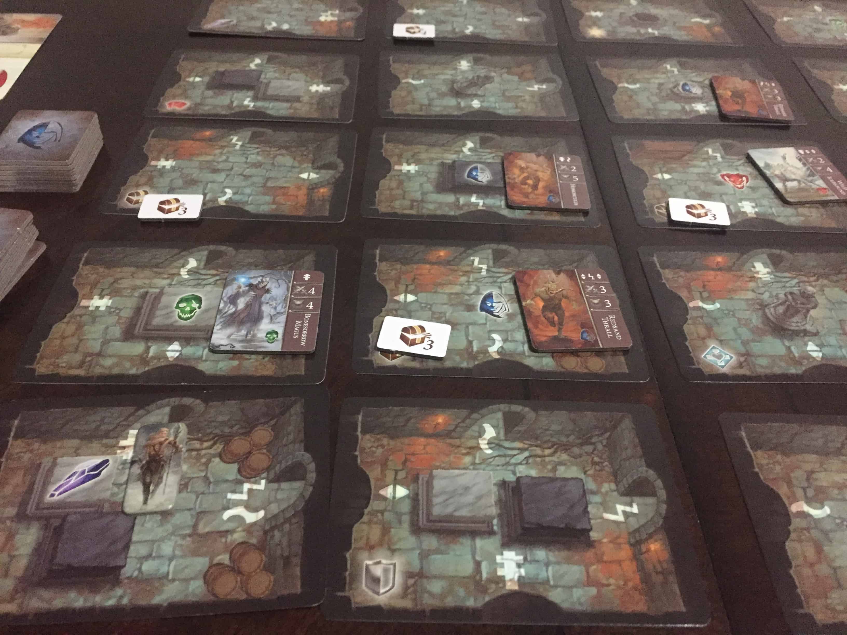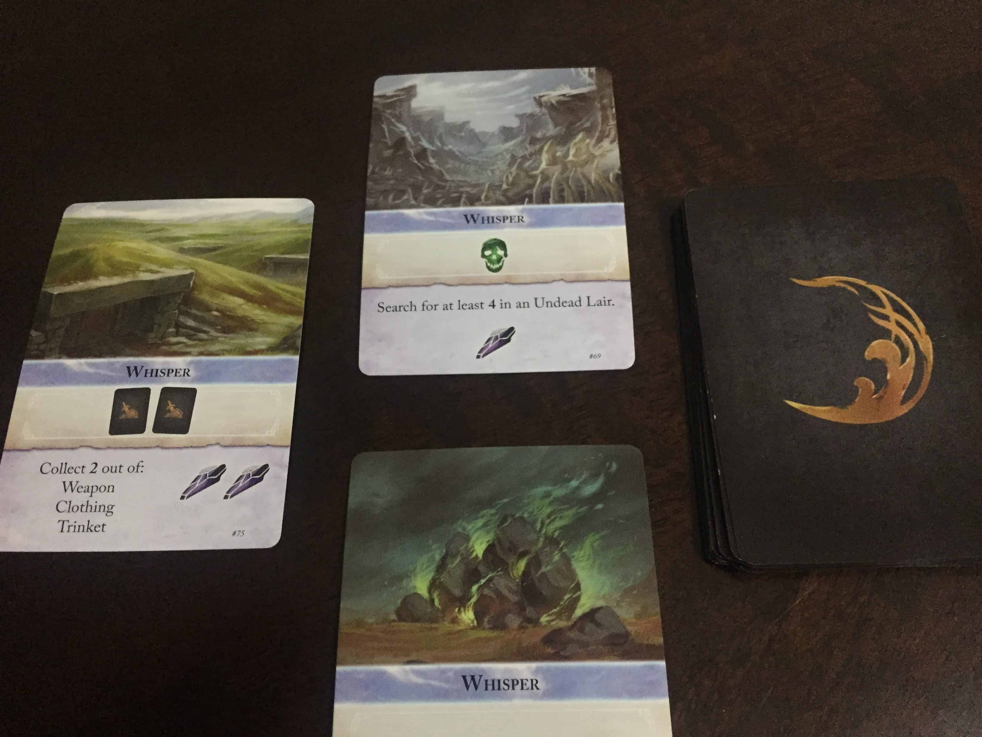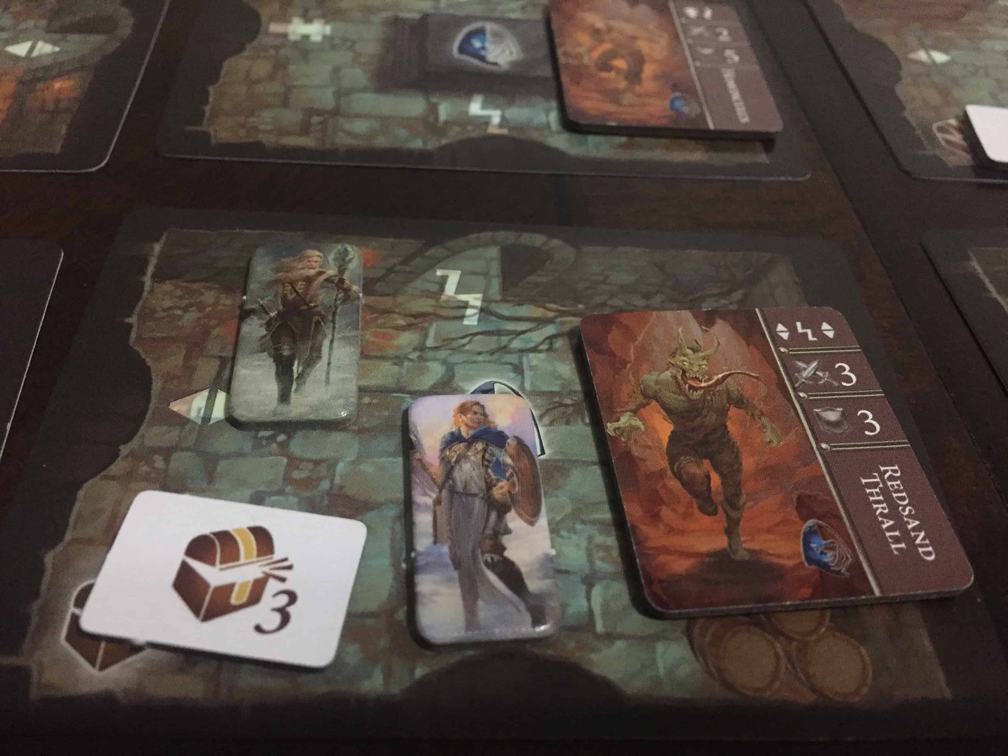 As you adventure through the dungeon, you will earn trophies from the enemies you kill as well as treasure tokens from successful searches. You use these to complete quests from a Whisper Deck that move the progress of the game along. In addition, you can also cash them in to buff your character, either with more action cards or with treasure. None of these power-ups really allow you to do anything differently; they mostly improve things that you can already do.