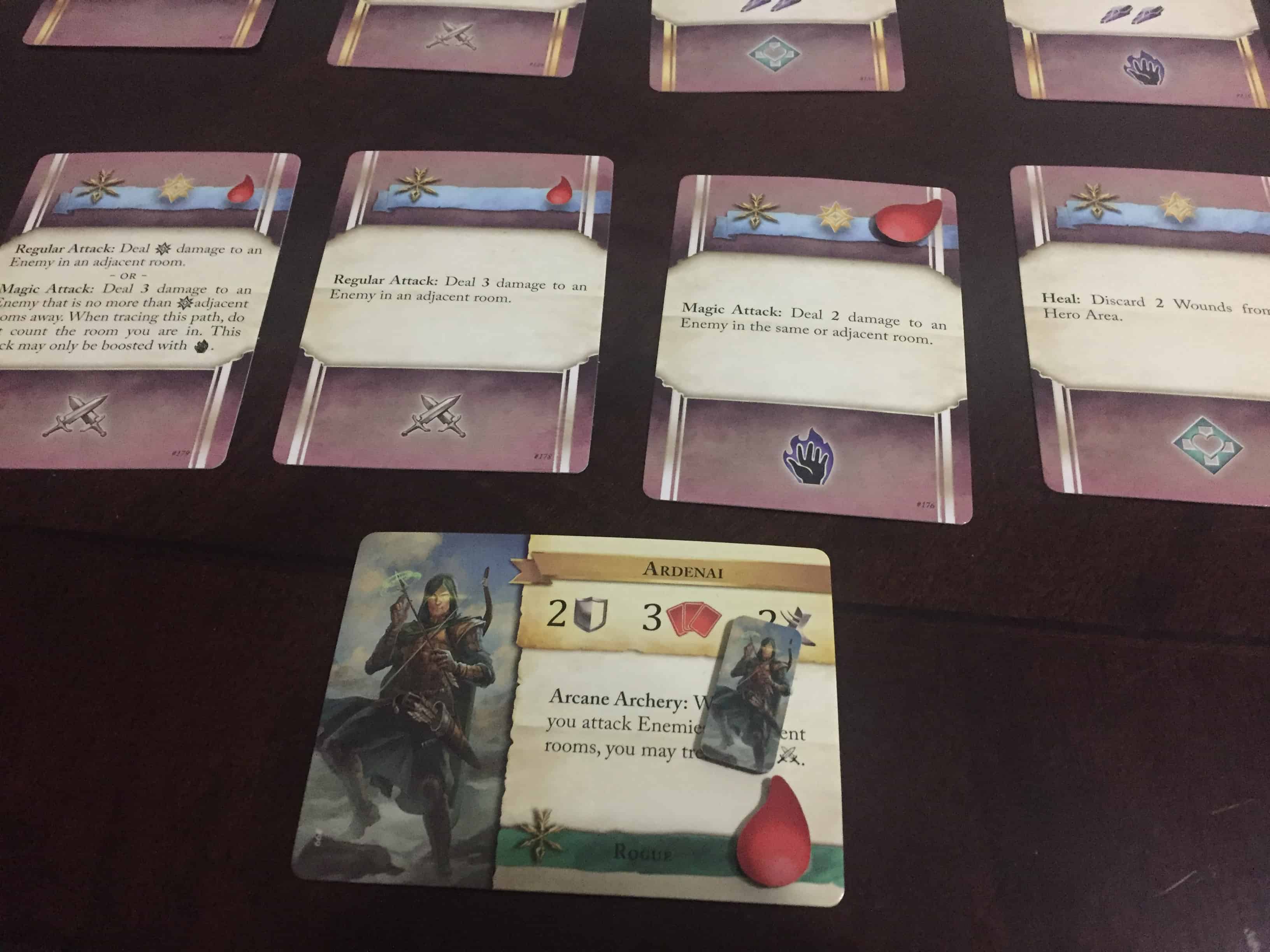 I also thought the designer did a good job differentiating the characters without making them TOO different. No matter the class, most character action cards were about 60-75% the same – basic attacks, heals, searches, etc. However, some characters had more frequent and/ or better search capabilities, or could draw from the Fate deck more or less often. Each character’s special attack was also very distinct. That made it easy to play many games with a bunch of different characters and not have to totally reset my brain every time.