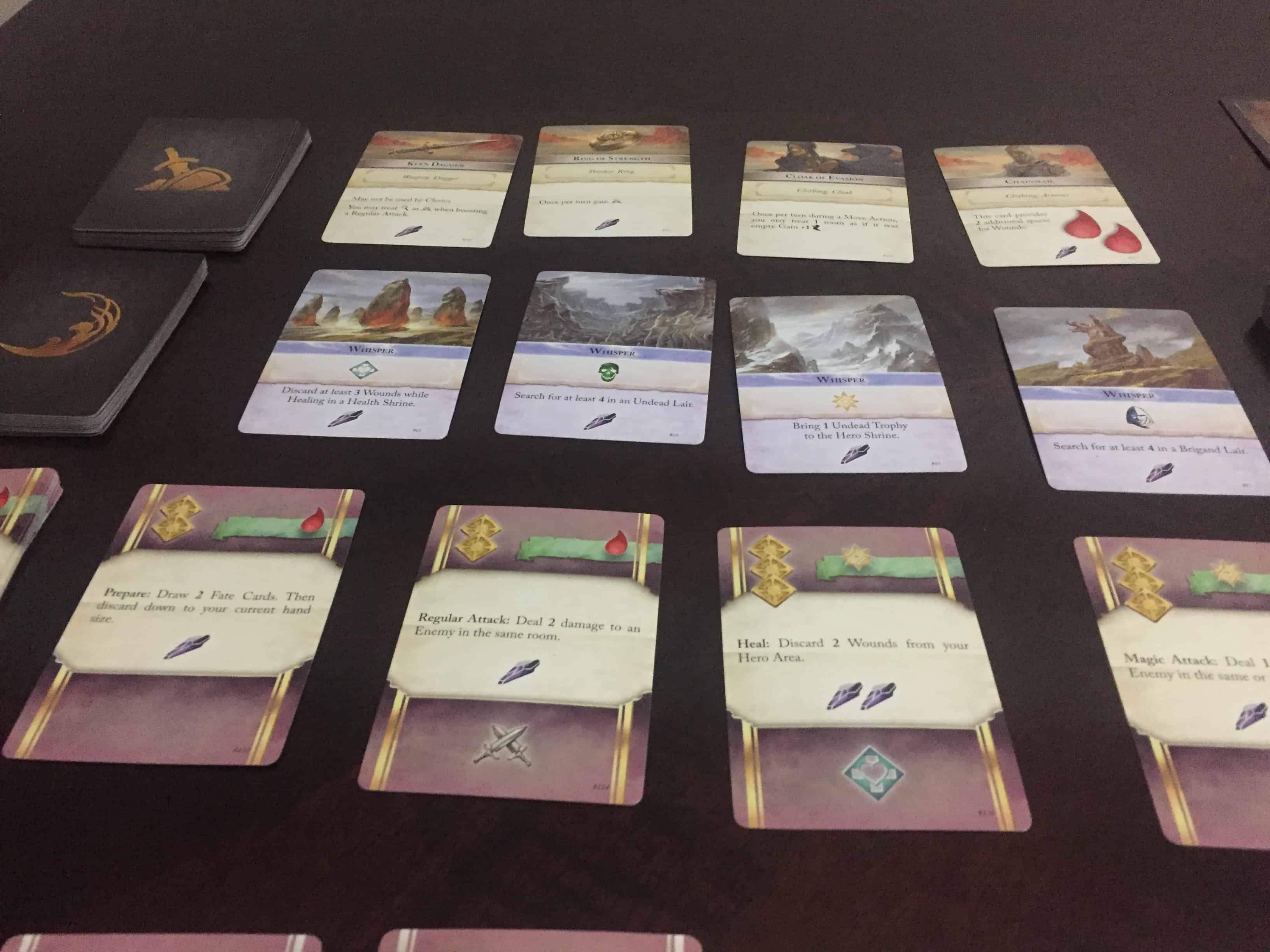 At the start of the game, you will receive your hero card, a set of double-sided action cards, some Fate cards that represent one time use powers, and a small token to represent your hero on the map (or a real mini, if you buy the Heroes of Mistfall Miniatures pack). The hero selection is standard fare – variations on rogue, wizard, cleric, fighter.