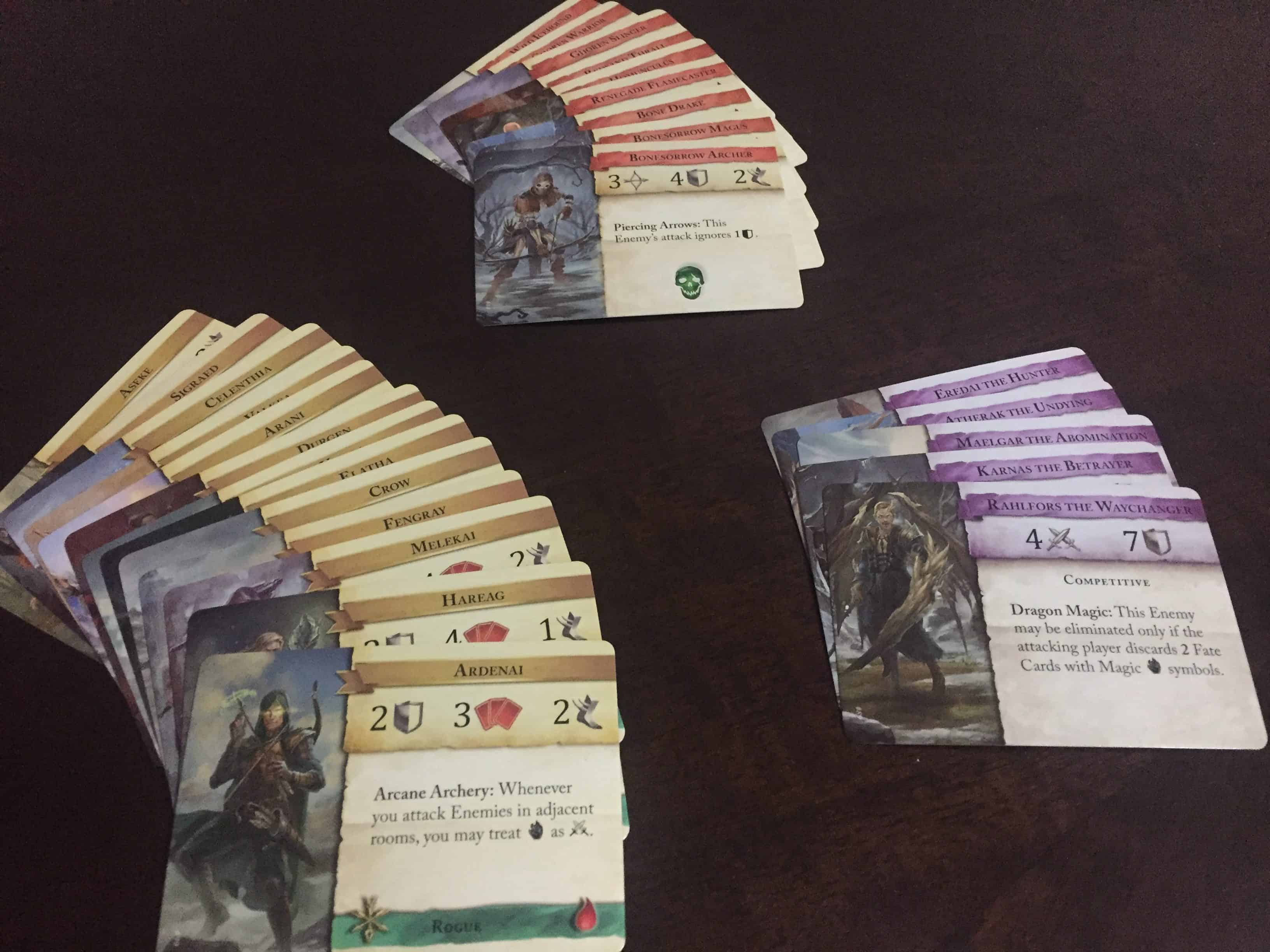 I also thought the designer did a good job differentiating the characters without making them TOO different. No matter the class, most character action cards were about 60-75% the same – basic attacks, heals, searches, etc. However, some characters had more frequent and/ or better search capabilities, or could draw from the Fate deck more or less often. Each character’s special attack was also very distinct. That made it easy to play many games with a bunch of different characters and not have to totally reset my brain every time.