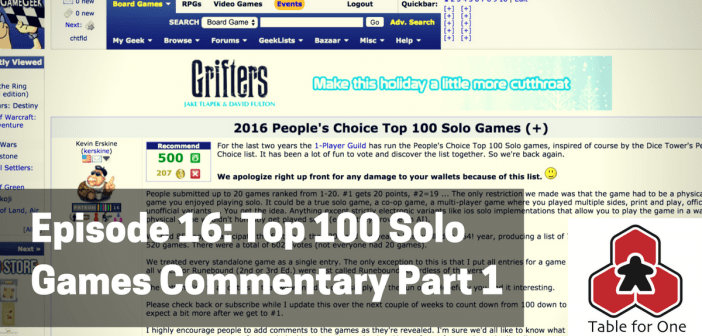 Every year for the last three years, Kevin Erskine has gathered votes from hundreds of solo gamers on Board Game Geek and created a gamer-voted Top 100 list of solo games. The 2016 edition of the list had nearly 400 voters and saw a bunch of interesting new games make the cut.