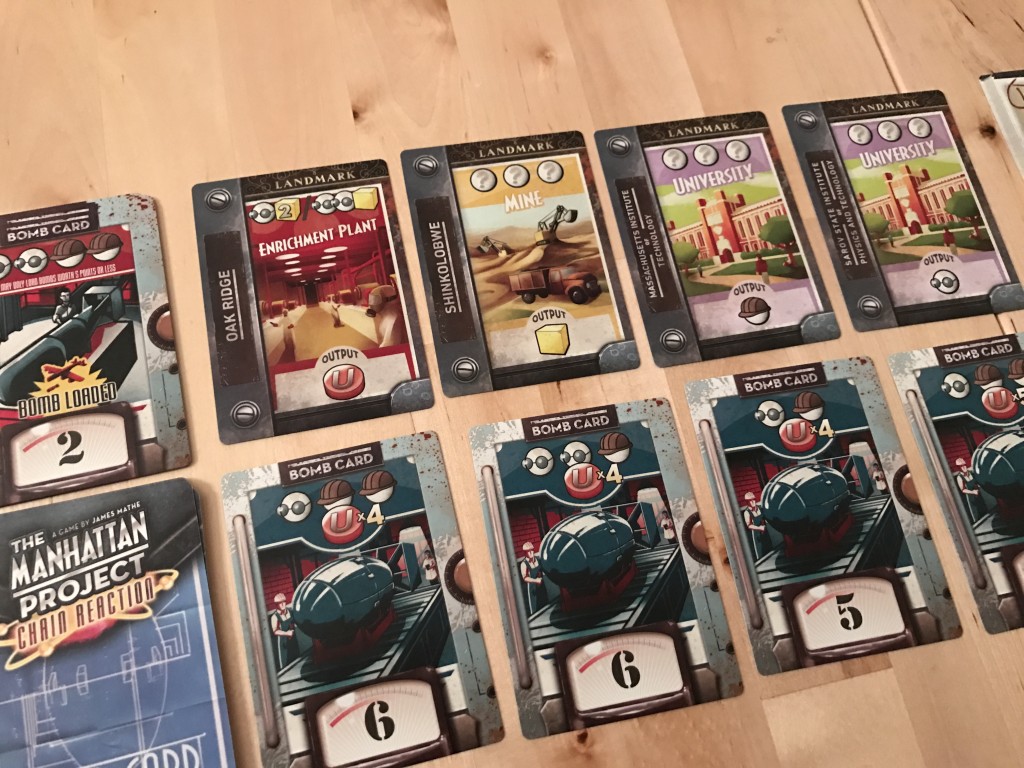 The rules for Chain Reaction are very straightforward. At the start of the game, you’ll setup a tableau for everyone at the table (the game plays 1-5). The tableau consists of common Landmark location cards, bomb cards to build, bomb loaded cards, and the resources you’ll be gathering (yellowcake and uranium). It looks like this: