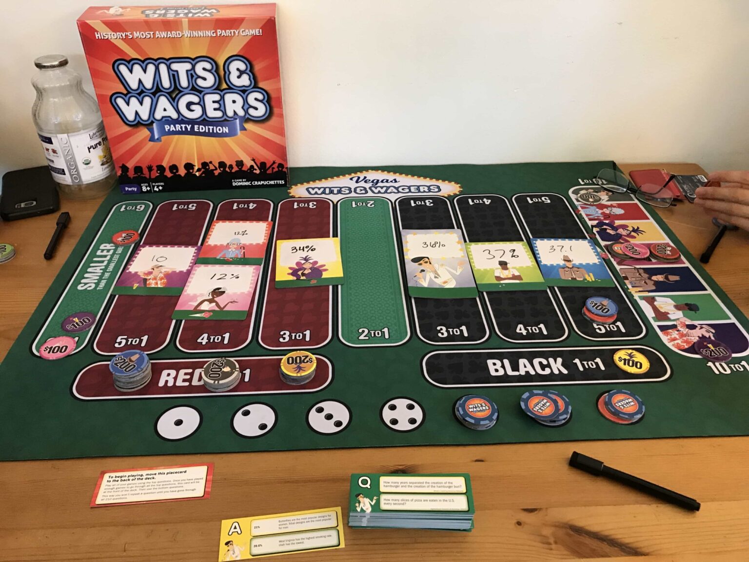 Now, as I said earlier, Wits aren’t as important as the Wagers as the vast majority of the answers aren’t common knowledge, but players compensate by gaining the range of numbers they get between player responses. The mat is double sided, with one side having the standard setup and the other the Vegas side offering additional options for betting.