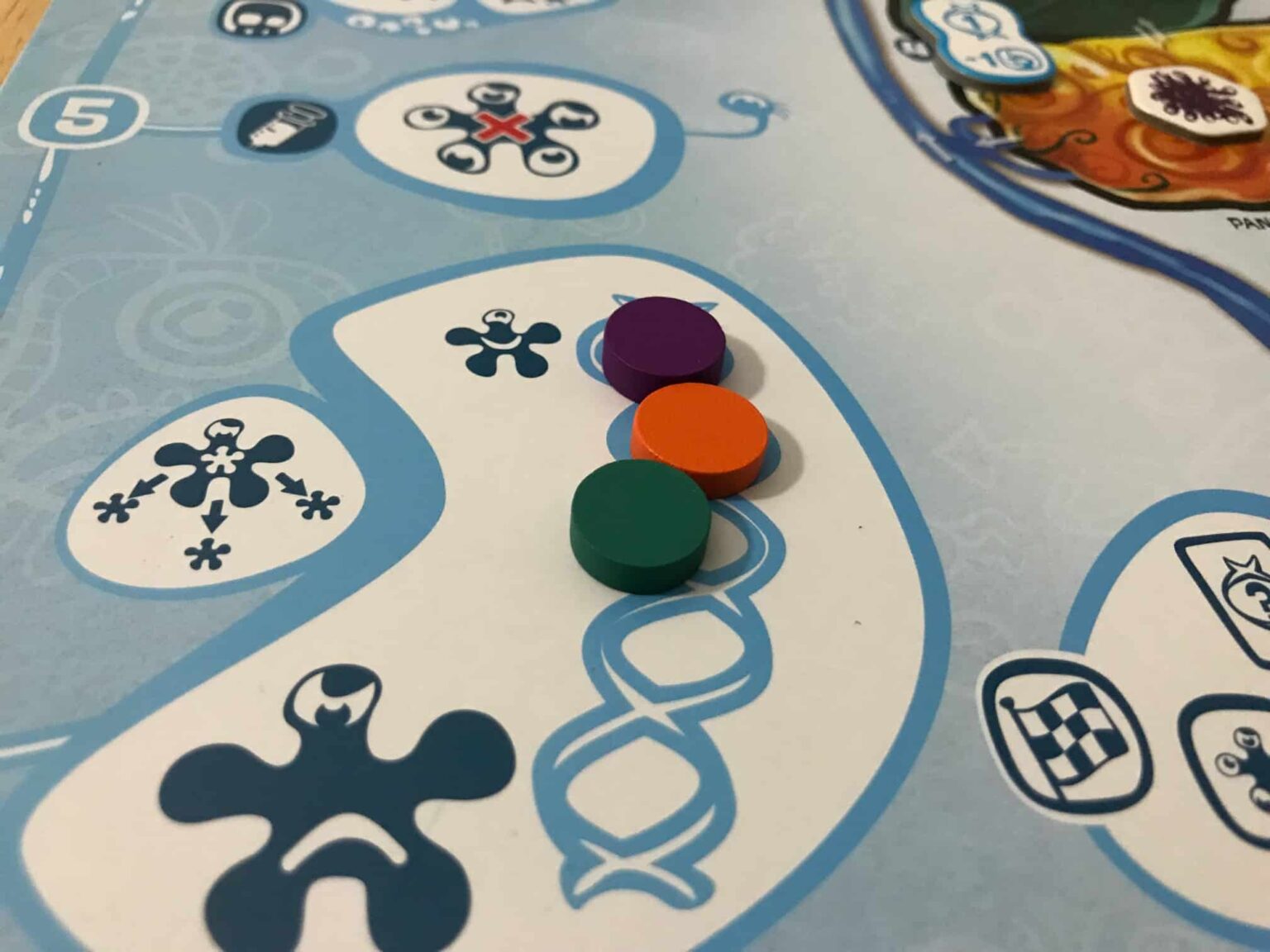 Once you reach the top space of the research track, all of your virus tokens will come off the board. This sounds cruddy, but it actually keeps the game flowing smoothly and will happen to every player an almost equal number of times. It’s managing when and how it happens that will be a big part of how you play the game.